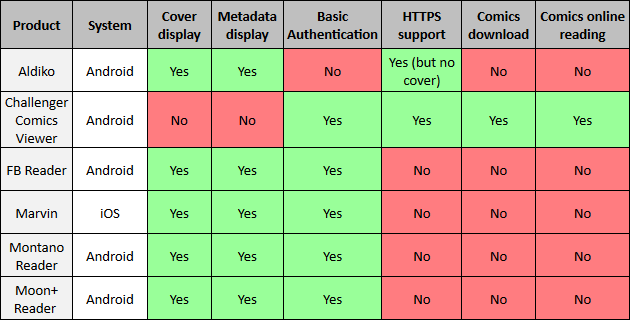 Note that the the "Comics online reading" column corresponds to a feature not supported by the original OPDS standard but is an extension developped for Ubooquity and Challenger Comics Viewer. More details here.